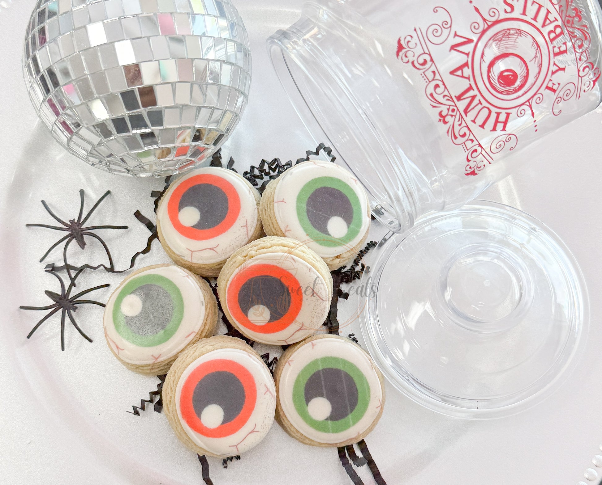 Eye mini cookies with a plastic Halloween theme jar. 8 mini cookies come in this container.